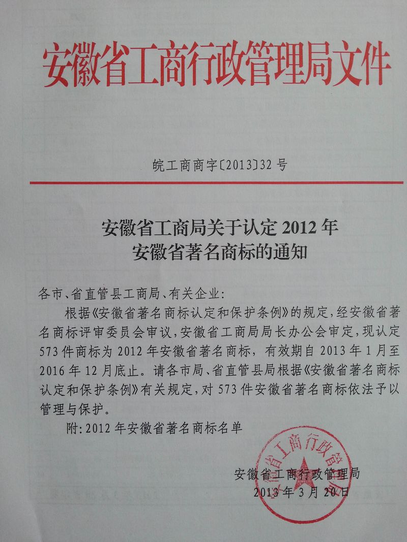 以下為安徽環(huán)瑞獲得著名商標(biāo)政府紅頭文件