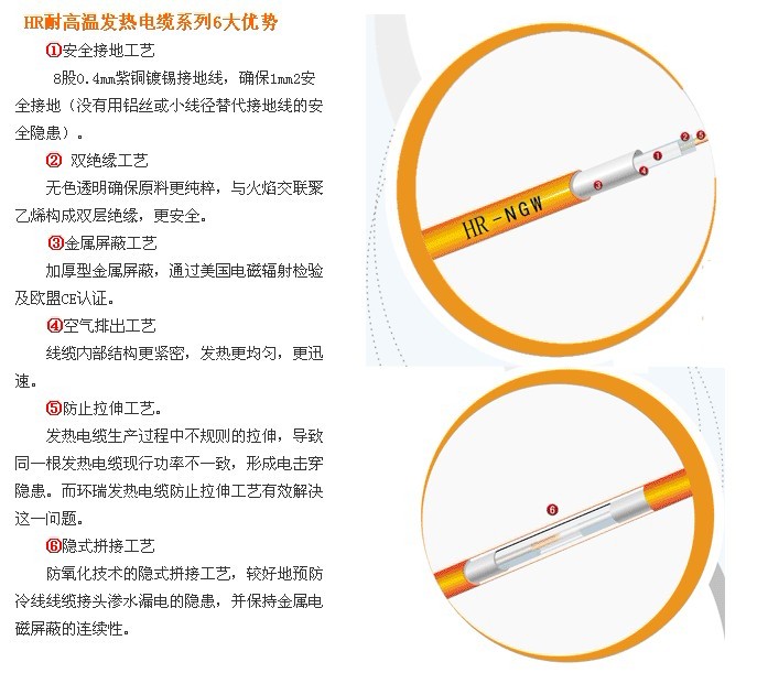 安徽環(huán)瑞采用新的雙絕緣工藝耐高溫的發(fā)熱電纜,包括有發(fā)熱合金,所述的發(fā)熱合金外依此包覆無色透明氟隆絕緣層、火焰及蒸汽交聯(lián)聚乙烯絕緣層、8*0.4mm鍍錫紫銅絲接地、加厚型金屬電磁屏蔽,阻燃型PVC外護套使用方便安全,壽命長,適用于高溫環(huán)境下的輻射供暖。