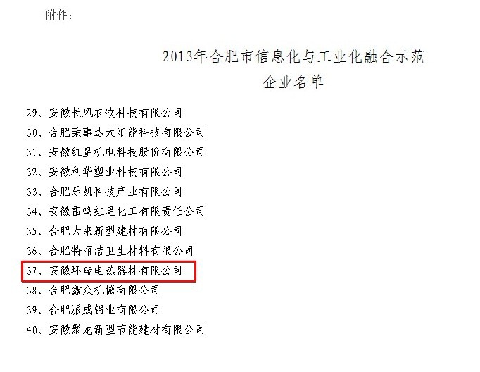 為加快推進我市兩化深度融合,發(fā)揮典型示范作用,依據(jù)《合肥市信息化與工業(yè)化融合示范企業(yè)認定管理辦法(試行)》和《合肥市第三方企業(yè)信息化公共服務平臺認定辦法(試行)》等文件,經企業(yè)申報、縣區(qū)推薦、專家評審和綜合審查,現(xiàn)確定安徽環(huán)瑞電熱器材有限公司,等40家為2013年合肥市 安徽環(huán)瑞將積極響應政府的有關倡導:不斷提升自身信息化應用水平,切實發(fā)揮示范企業(yè)帶動作用,認真總結信息化建設經驗,積極探索利用信息技術推動產業(yè)升級轉型,發(fā)展新型業(yè)務模式,培育新業(yè)態(tài),走出一條合肥特色的信息化與工業(yè)化深度融合的“科技環(huán)瑞”的發(fā)展道路,促進電伴熱帶,發(fā)熱電纜產業(yè)結構優(yōu)化升級,最終為振奮合肥的經濟,做出貢獻!