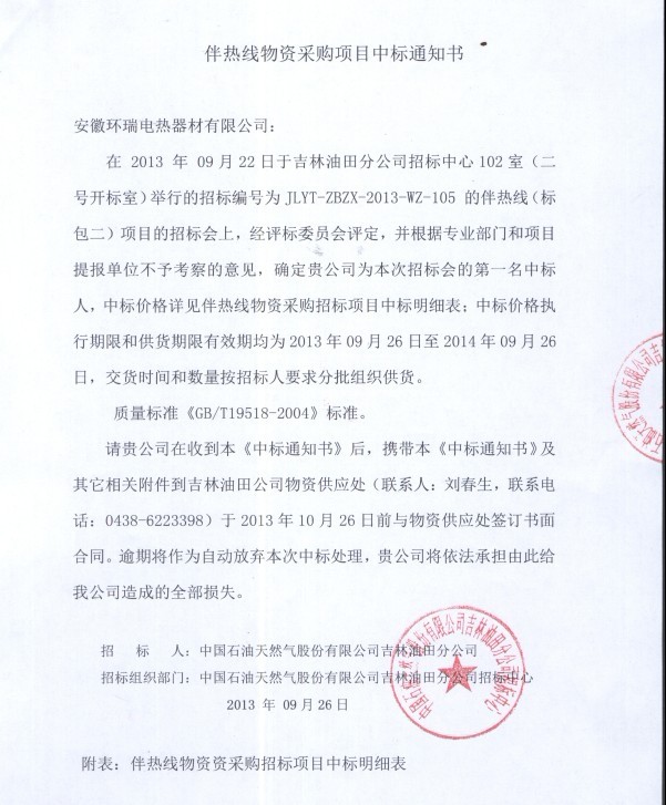 此次成功競(jìng)標(biāo)吉林油田,也是甲方在去年使用過(guò)我司的電伴熱帶后做的慎重選擇,是對(duì)于我司電熱帶產(chǎn)品質(zhì)量的主要肯定。 本次項(xiàng)目包括自限溫、恒功率電熱帶兩大系列。目前正在緊張的進(jìn)行后續(xù)的項(xiàng)目合作中。以下為環(huán)瑞中標(biāo)通知書