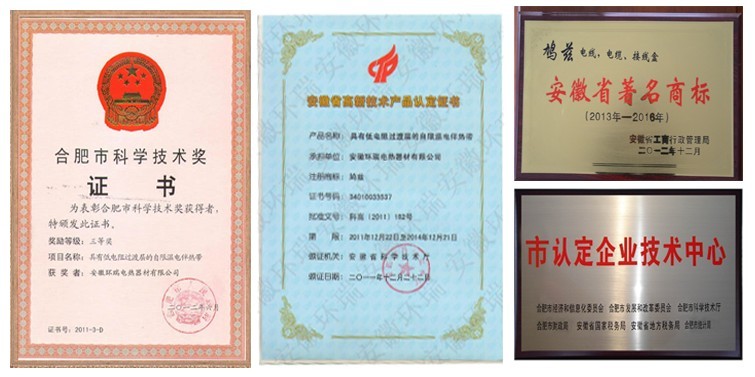安徽環(huán)瑞擁有21項(xiàng)自主知識(shí)產(chǎn)權(quán),其中包括:2項(xiàng)國家發(fā)明專利;4項(xiàng)新型電伴熱帶、發(fā)熱電纜生產(chǎn)核心技術(shù)(1、雙層共擠技術(shù),2、束代絞預(yù)恒張力絞線,3、一體化熱線冷線隱式拼接,4、三層共擠技術(shù));5項(xiàng)核心新型產(chǎn)品(1、具有低電阻過渡層的電伴熱帶,2、一種安全塑料體的電伴熱帶,3耐高溫耐磨的發(fā)熱電纜,4、太陽能熱利用電伴熱帶,5、新型長距離并聯(lián)、串聯(lián)恒功率電熱帶);10項(xiàng)行業(yè)專用電伴熱帶(消防專用電伴熱帶、電廠煙氣脫硫?qū)S秒姛釒?、太陽能熱水器本質(zhì)安全型電熱帶、石油管道伴熱專用電熱帶、汗蒸房專用電熱帶、天溝融雪專用發(fā)熱電纜、混凝土養(yǎng)護(hù)專用發(fā)熱電纜、畜牧養(yǎng)殖專用發(fā)熱電纜等)。安徽環(huán)瑞憑借此項(xiàng)榮譽(yù)獲得了省科學(xué)技術(shù)獎(jiǎng)、高新技術(shù)產(chǎn)品證書及國家地暖行業(yè)、省建設(shè)廳榮譽(yù)推廣證書。