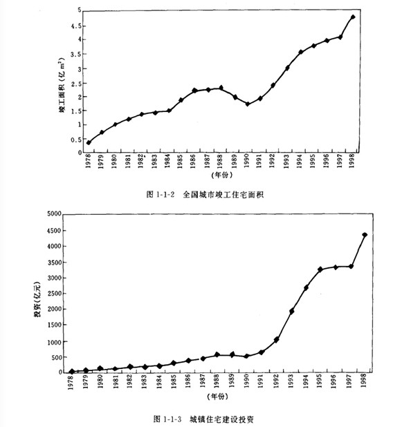 我國地域廣闊.人口眾多.房屋建筑規(guī)模巨大。其中住宅建設約占居住建筑的92%.而住宅,是世界各國都面臨的社會問題。“人人享有適當?shù)淖》?rdquo;已成為聯(lián)合國第二次人居大會所提出的戰(zhàn)略目標。改革開放以來.從1979年到1998年底.我國城鄉(xiāng)新建住宅建筑面積158億 ㎡其中城鎮(zhèn)住宅宅 約35億 ㎡.農(nóng)村作宅約123億MI.全國城市人均居住面積從3. 6 ㎡增加到9.3 ㎡(圖一1一1).竣 工面積從3 752萬 ㎡增加到47 600萬 ㎡(圖1-1-2).城鎮(zhèn)住宅建設投資從39.21億元增加到4 310.81億元(圖1-1 3). 1.7億戶遷入新居."八五"期間共完成城市住宅建設投資8 543億元.竣工 住宅10.5億 ㎡,僅1995年住宅竣工面積3.3億 ㎡.比“七五”期間增長76%.九五.期間計劃建設 住宅12億 ㎡,比“八五”期間增長14.3%.到1999年底。我國設城市加為668個.當年全國城市新 建房屋竣工面積4.362 5億㎡.其中住宅2.971 6億㎡.當年底.全國住宅總使用面積為30.505 2億 ㎡.總居住面積為21.011 2億㎡.人均使用面積達到14.2 ㎡.人均居住面積達到9. 8 ㎡分別比上 年增長0.6和0. 5 ㎡.居民生活條件大有改善。住宅建設量大面廣.至今仍呈上升趨勢.而且這個 上升趨勢還將持續(xù)20-30年。由此看出,我國住宅建設正處于快速發(fā)展階段.不僅是中國歷史上的 最高峰.也是世界上任何一個國家所不可比擬的。
