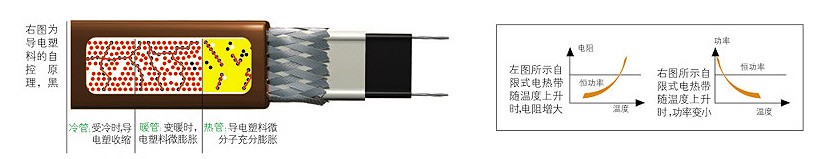 自限溫電熱帶的帶芯是一種很復雜的高分子復合物,它由多種材料和導電介質復合而成,經(jīng)過特定的化學變化和物理處理之后擠出成型,在兩條平行導線之間組成的一條保持連續(xù)平行的加熱原件。在加熱過程中,這個高分子材料的內部半導體通道的數(shù)量----電阻發(fā)生了驚人的正溫度系數(shù)(簡稱PTC效應)的變化,且具有特殊的分子記憶能力,而且這種記憶性反應強烈。當環(huán)境溫度升高時,高分子聚合物微分子膨脹,碳粒漸漸分開,引起了電路中斷,電阻上升,伴熱線自動減少功率輸出;當環(huán)境溫度降低時,高分子聚合物微粒間距又收縮變小,碳粒相應連接起來形成電路,伴熱線發(fā)熱功率又自動上升;當環(huán)境溫度處于某一穩(wěn)定狀態(tài)時,系統(tǒng)將達到熱輸出穩(wěn)定,使其具有溫度自限性。它控制溫度不會過高亦不會過低,能自動調解。從而,達到了安全可靠的目的。