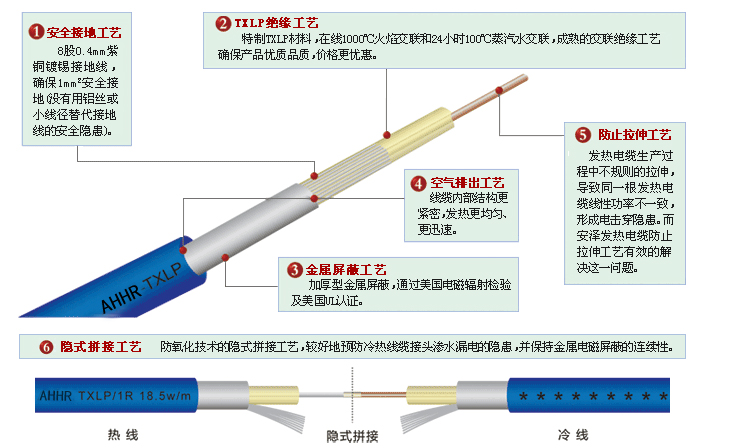 發(fā)熱電纜內芯由冷線熱線組成,外面由絕緣層、接地、屏蔽層和外護套組成,發(fā)熱電纜通電后,熱線發(fā)熱,并在40~60℃的溫度間運行,埋設在填充層內的發(fā)熱電纜,將熱能通過熱傳導(對流)的方式和發(fā)出的8-13um的遠紅外線輻射方式傳給受熱體。