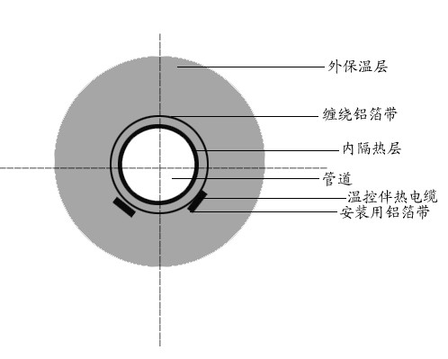 由于蒸汽掃線時間相對較短。一般控制在30分鐘左右??刹捎孟聢D雙層保溫結構來保證使用。一般來說,這種結構的內(nèi)層保溫厚度為5-10mm.在內(nèi)保溫層外加包鋁膠帶,鋁膠帶上敷設自控溫電熱帶。每毫米內(nèi)層保溫層可使掃線溫度減低10℃左右,或采用隔離支架,每米1—2只,效果也較理想。當然,在掃線時必須停止通電,管線熱損失仍按常規(guī)設計,保溫層厚度只能按外層為計算厚度。