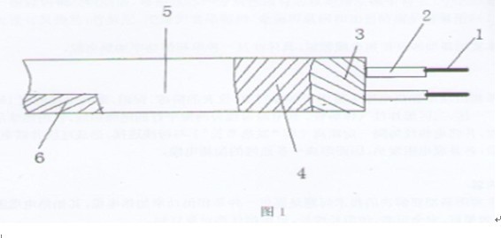 參見圖1,一種單相恒功率電伴熱帶,包括有二個電纜內(nèi)芯,其特征在于:每個電纜內(nèi)芯分別由一根鍍錫銅絞線組成,1、每根線芯分別包覆有芯線絕緣層氟塑料2、二個芯線絕緣層外依次包覆有發(fā)熱絲3、骨架層4、絕緣護套氟塑料5、金屬屏蔽網(wǎng)6和加強防腐護套氟塑