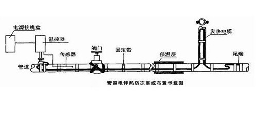 當(dāng)敷設(shè)單根電熱帶時(shí),敷設(shè)時(shí)應(yīng)盡可能使電熱帶平整地緊貼在管道表面,用聚酯帶或鋁箔膠帶固定,嚴(yán)禁用細(xì)絲捆扎,如遇法蘭、閥門等尖銳突起部分,應(yīng)注意保護(hù)。在水平管道上安裝時(shí),可敷設(shè)在管道下45度側(cè)方,用玻璃纖維壓敏膠帶或鋁膠帶每隔約30Cm處將電熱帶固定于管道上。如上圖電熱帶應(yīng)按管道長度分布,以免物料在無電熱帶處降溫凝結(jié),電熱帶的長度應(yīng)長于被伴熱管道。在線路的第一供電點(diǎn)和尾端各預(yù)留1m長的電熱帶。電熱帶在穿過墊木等支架時(shí),應(yīng)在支架上打眼穿孔,必須保證伴熱帶緊貼在管道上,再使用密封膠封堵。每個(gè)回路的電熱帶安裝完畢,再確認(rèn)整個(gè)回路長度滿足設(shè)計(jì)要求后,才可剪短電熱帶。